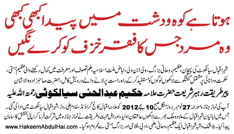Pride of Pakistan, Famous Sufi Saint, Huzoor Roomi e Asar Wali Ibne Wali, Hazrat Qibla Hakeem Abdul Hai R.A, was born in a famous religious family of Alhaaj Hakeem Khadim Ali R.A in Sialkot Pakistan. He was passed away on Monday about 12:20 PM, 26 November 2012, after protracted illness. |